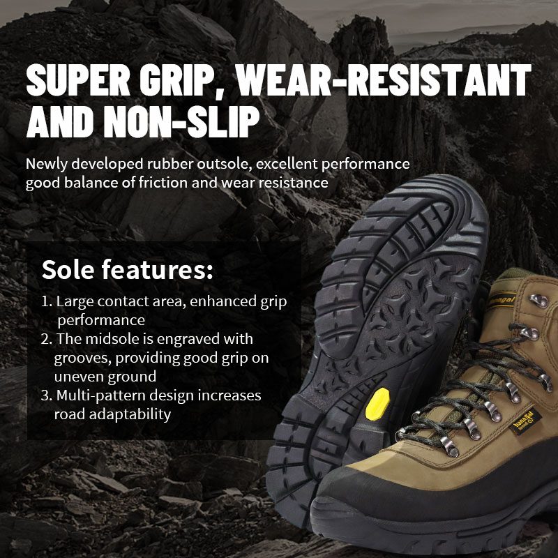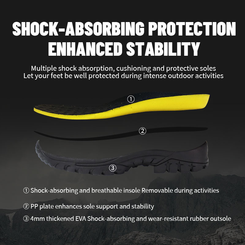 ① Semelle intérieure rembourrée et respirante, amovible lorsque vous devez la nettoyer ou la remplacer. ②Renforcé avec une plaque en PP pour un soutien supplémentaire sous le pied, afin que chaque pas soit solide et contrôlé. ③ Semelle extérieure en caoutchouc EVA épaisse de 4 mm absorbant les chocs et résistante à l'usure.