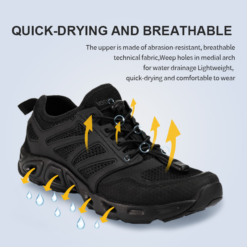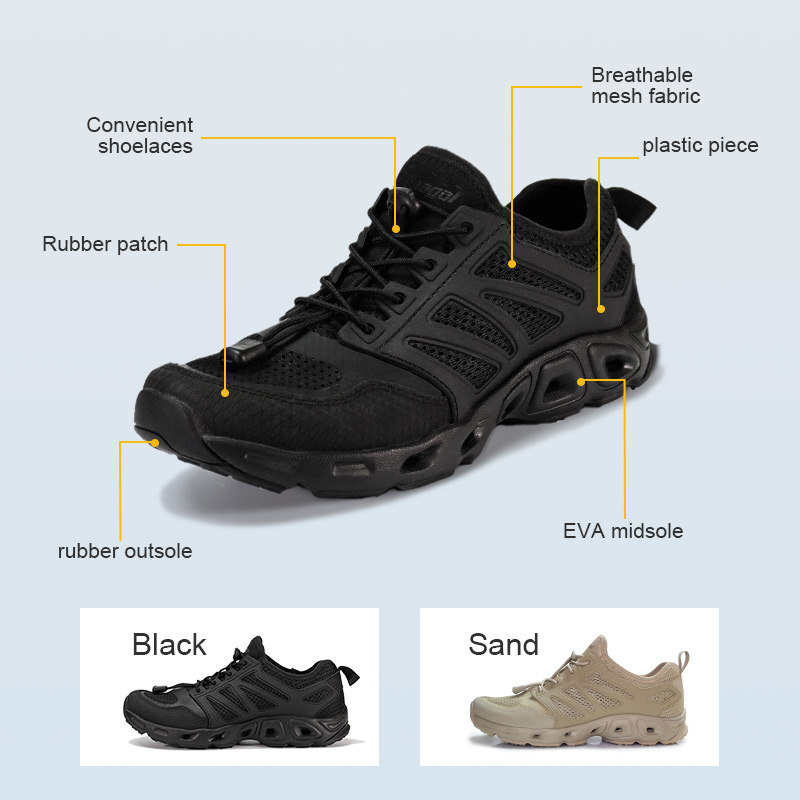 -Léger et respirant -Drainage et séchage rapide -Semelle intermédiaire en EVA absorbant les chocs -Conception de lacets pratique