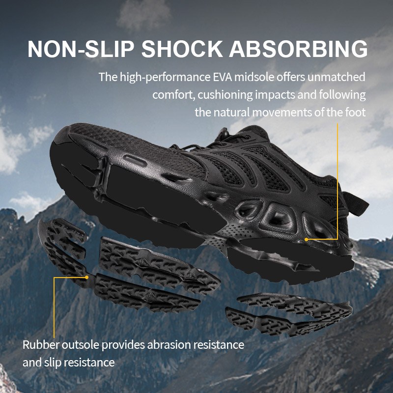 Les chaussures de randonnée EVA absorbant les chocs sont conçues pour les sentiers mouillés ou secs. Avec des matériaux à séchage rapide et des ports de drainage dans la voûte, il évacue l'eau rapidement lorsque vous passez du ruisseau au sommet. Un patch en caoutchouc au talon assure la stabilité, tandis que la semelle intermédiaire en EVA offre un confort doux et absorbant les chocs sous le pied. Et la semelle extérieure en caoutchouc robuste ? Conçu pour adhérer à presque tout : roches, boue, graviers meubles. Il est amphibie, agile et conçu pour évoluer avec vous.