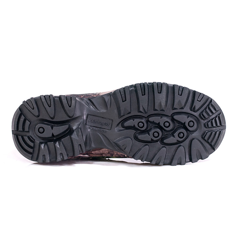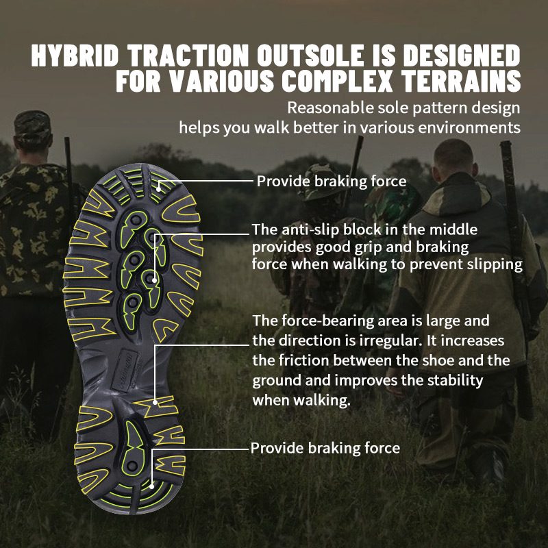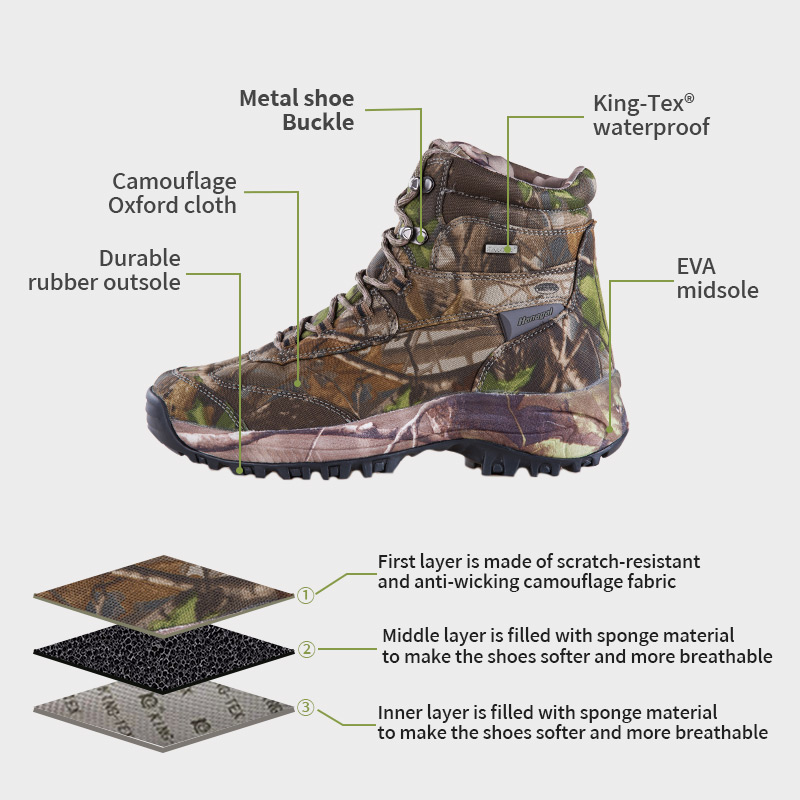 ① La semelle intérieure Poliyou hautement extensible qui évacue l'humidité garde l'intérieur au sec. ②Semelle intercalaire en EVA, enveloppée dans un tissu de camouflage, amorti et absorption des chocs. ③Semelle extérieure en caoutchouc durable, antidérapante et résistante à l'usure.